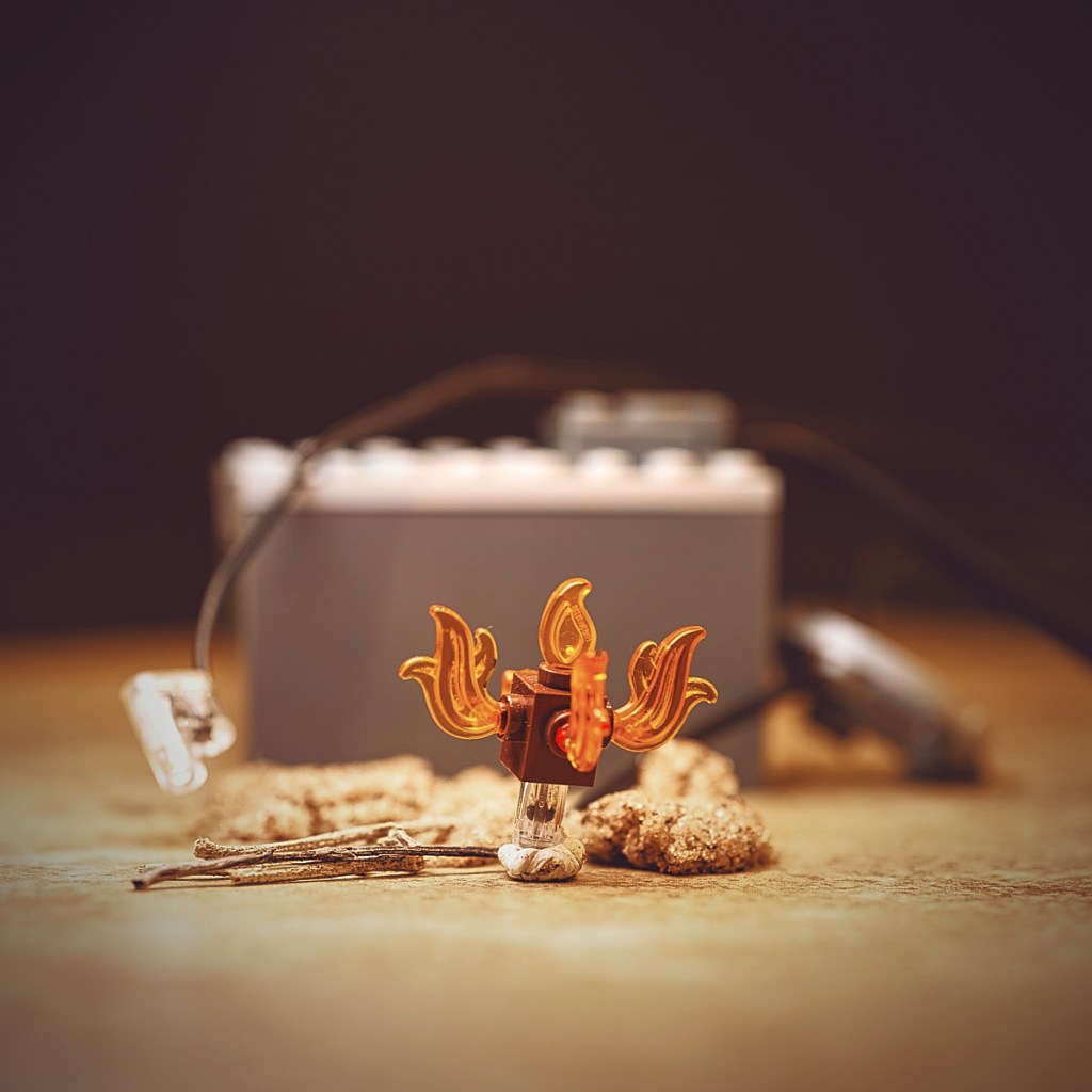 To create the scene, I used play sand as the surface, small rocks for background, dried leaf stems as firewood, and with lighting produced by a LEGO Power Functions Led light (held in place with sticky putty, and with the wire hidden under the sand).