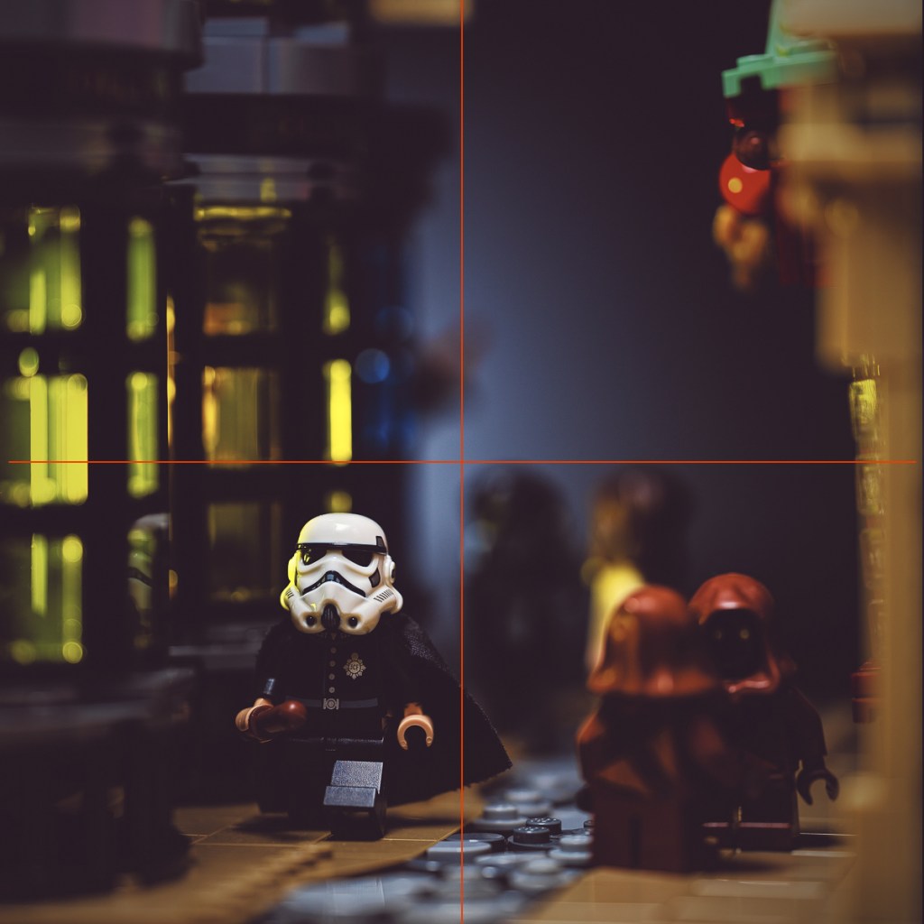 To help draw our eyes to the subject, I used the rule of thirds to place him within the frame. Similarly, I placed the Jawas beside him to help establish the Mos Eisley context.