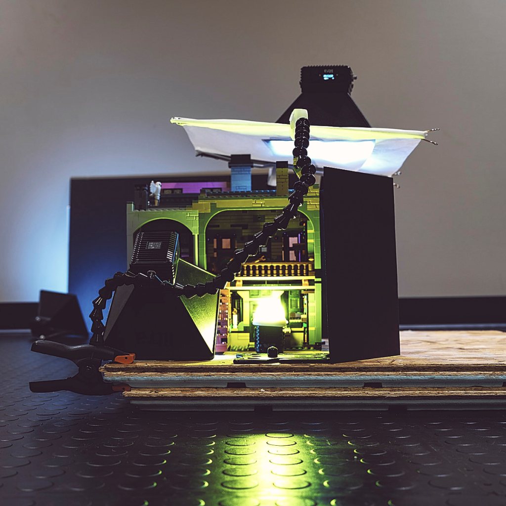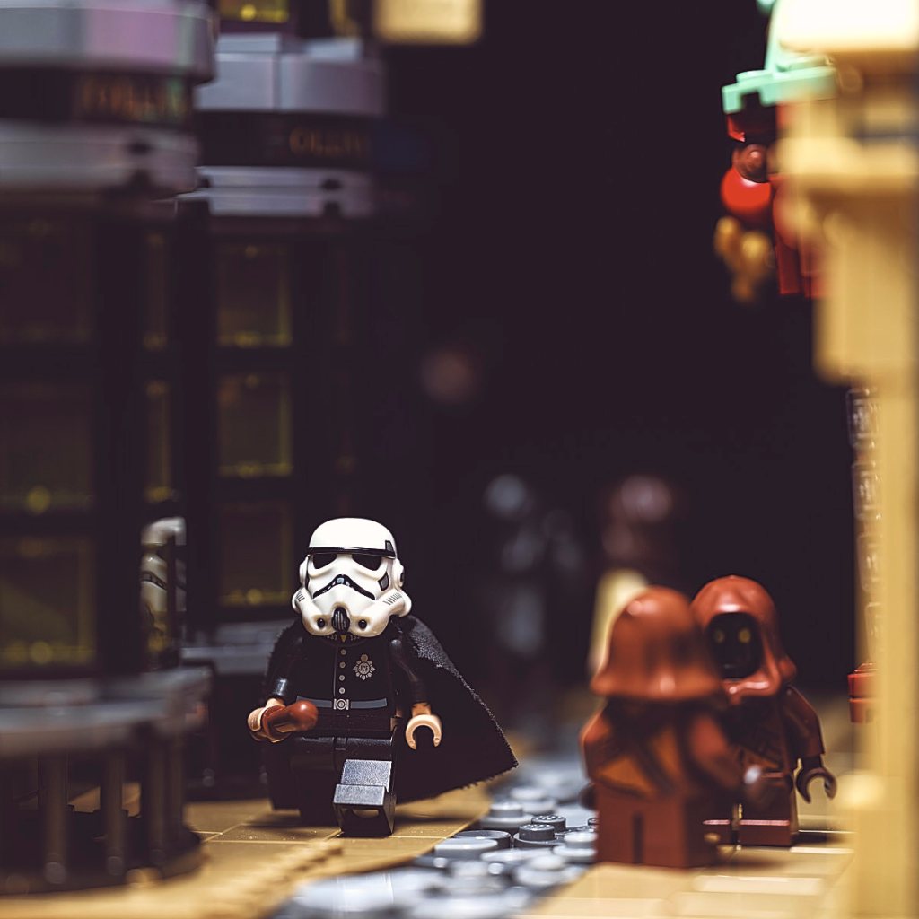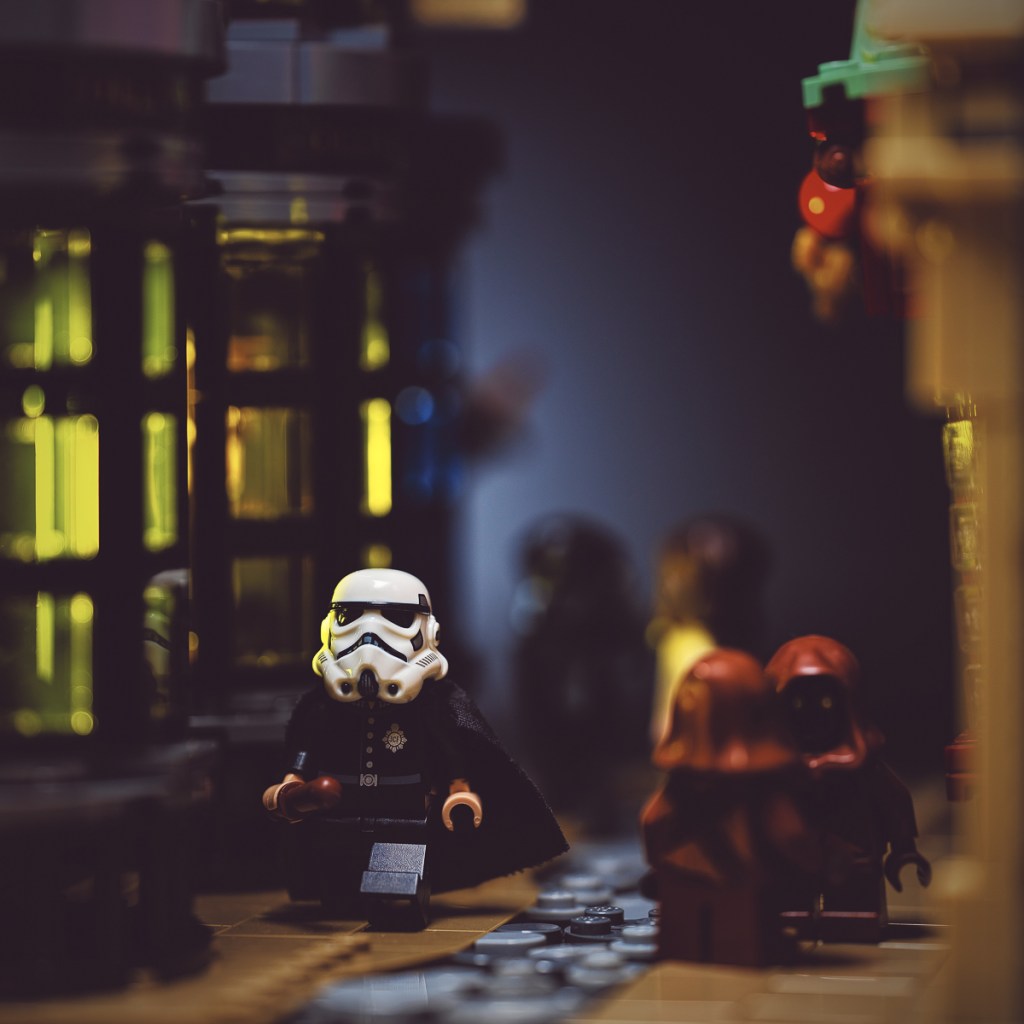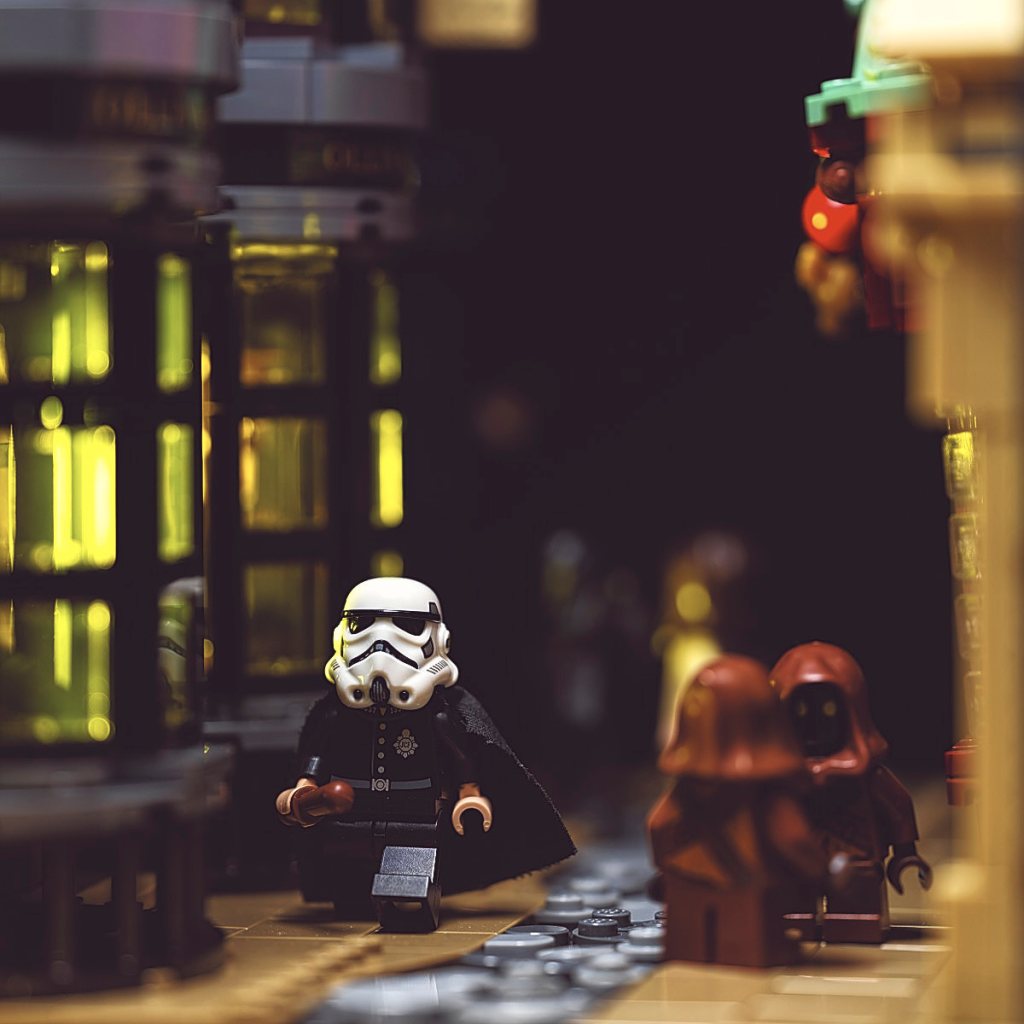 Wanting to create a more realistic atmosphere, I placed a LitraTorch 2.0 with yellow filter and diffuser inside the building to the Stormtrooper’s right, so that its light would spill out through the bay windows into the street. I’ve turned the set 90 degrees here for a better look.