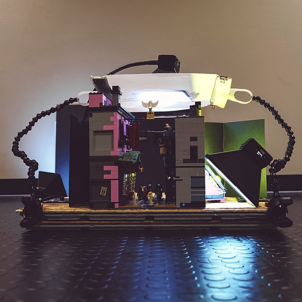 This documentary look at the scene shows how I set the stage with two buildings from the LEGO Harry Potter 75978 Diagon Alley set: Olivander’s Wand Shop & Scribullus placed opposite Quality Quidditch Supplies & The Daily Prophet.