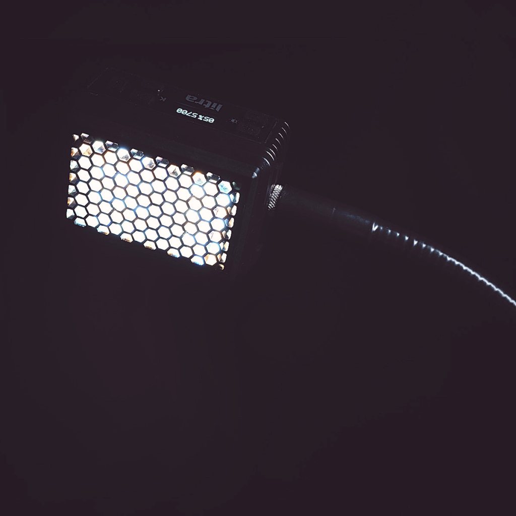 I used a single LitraPro with honeycomb grid, creating hard light with defined shadows while also controlling spill.