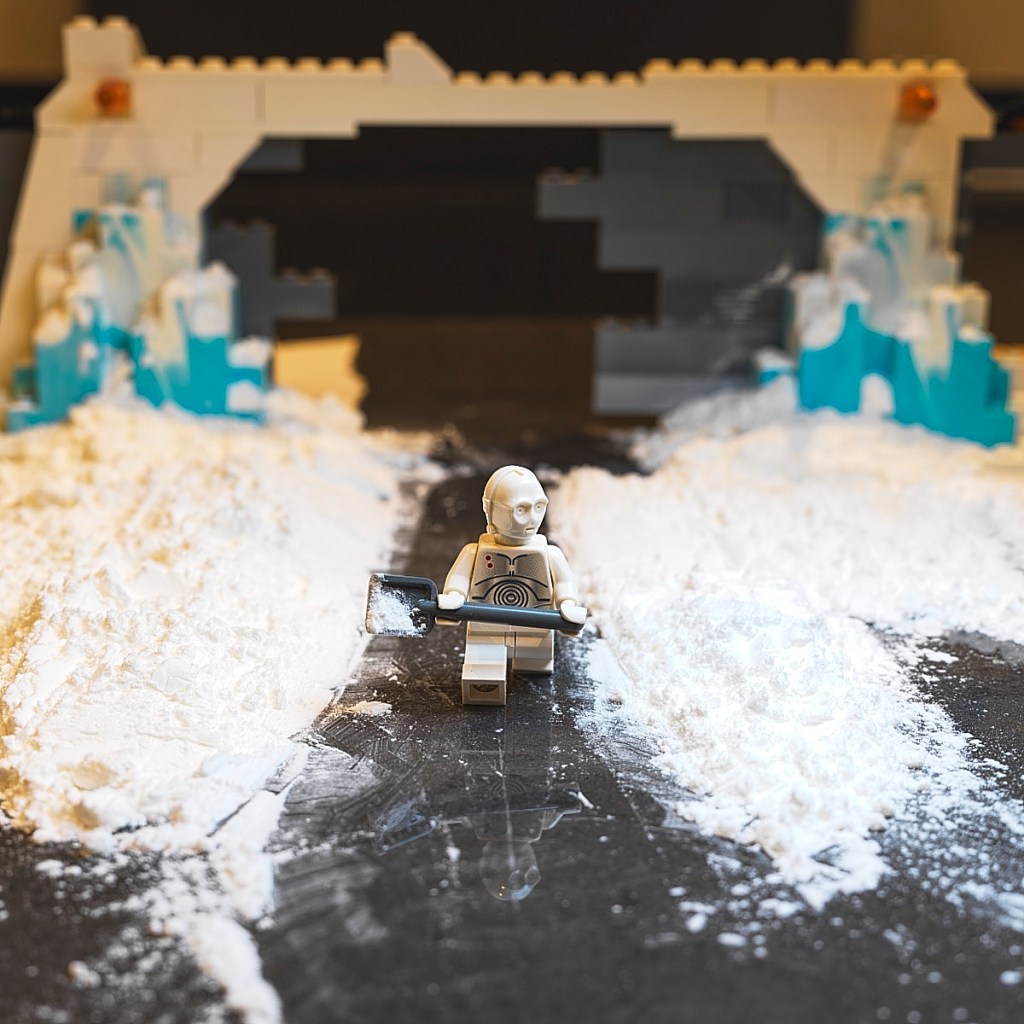 Having recently written a review of the silver-plated TC-14 protocol droid, my thoughts turned to K-3PO and my Hoth Rebel Base set. I decided to explore the general idea of a snowy scene at the base, with the character outdoors and framed by the hangar doorway.