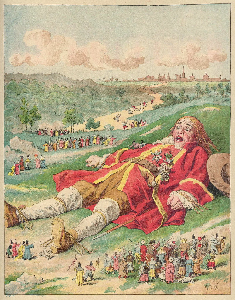 During his first travels, Gulliver washes ashore after a shipwreck and finds himself a prisoners of a race of tiny people: the Lilliputians.