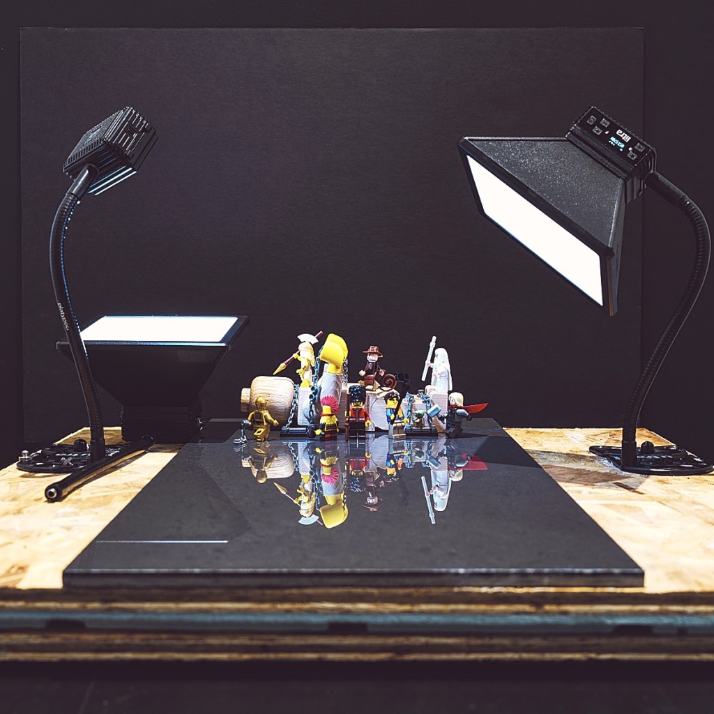- Fill 1: Litrapro with softbox, aimed at the front row of minifigures, positioned by Platypod gooseneck arm and Ultra tripod base.
