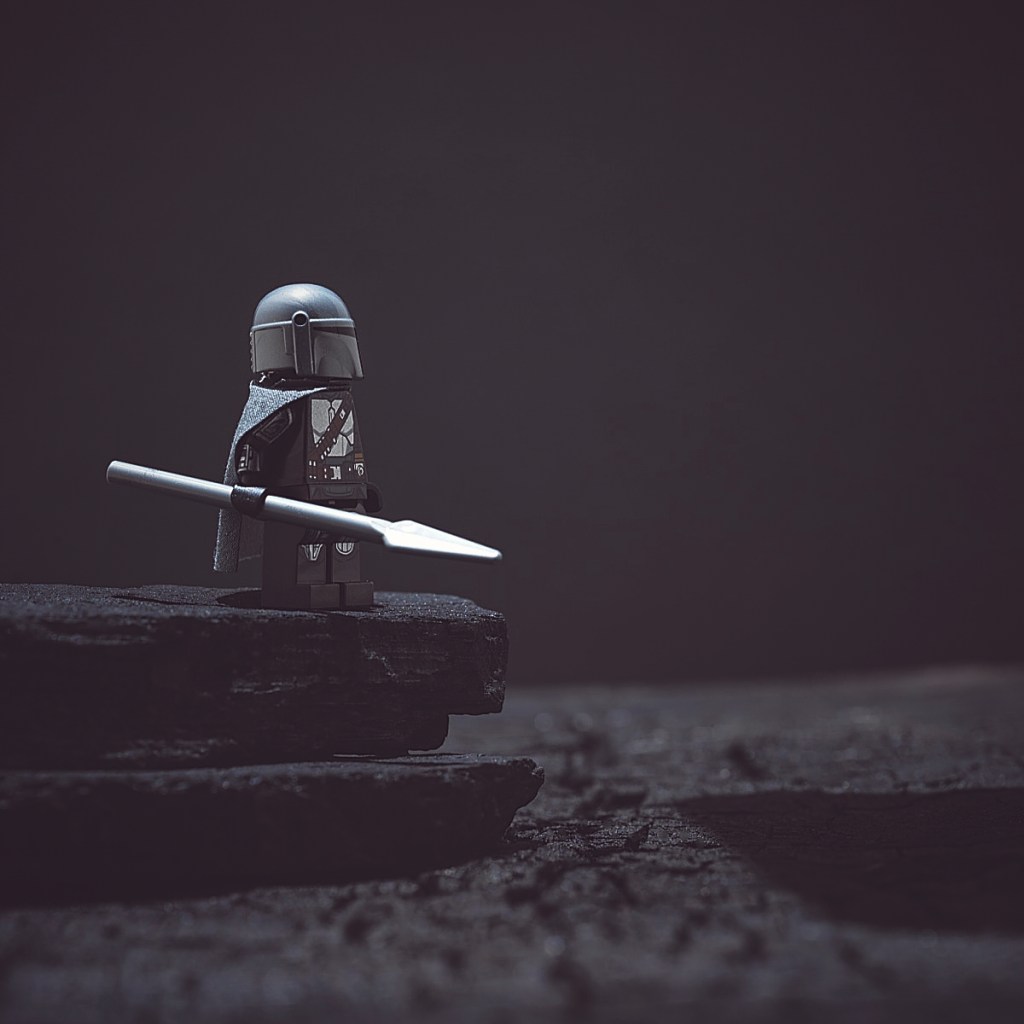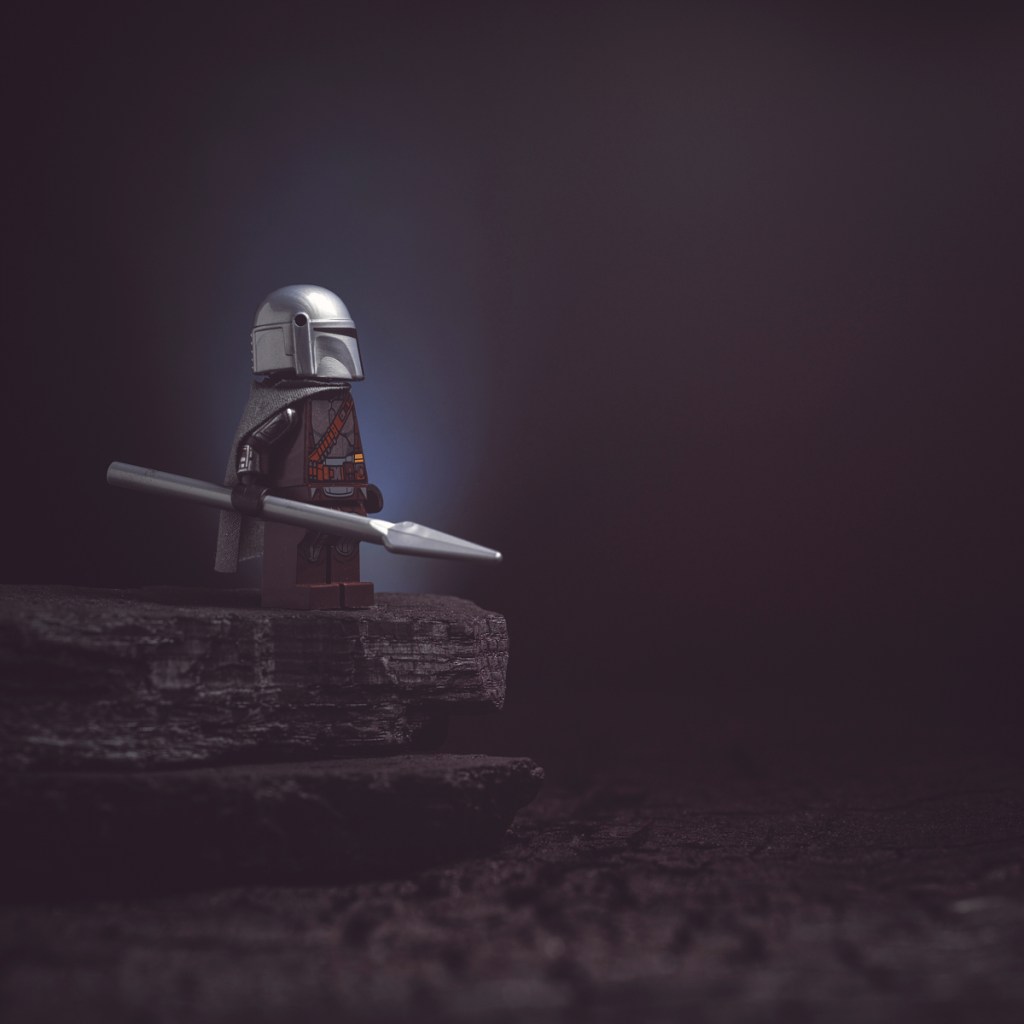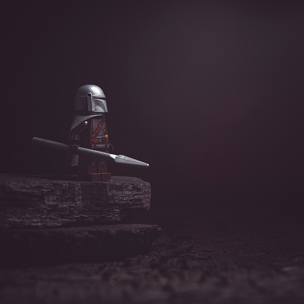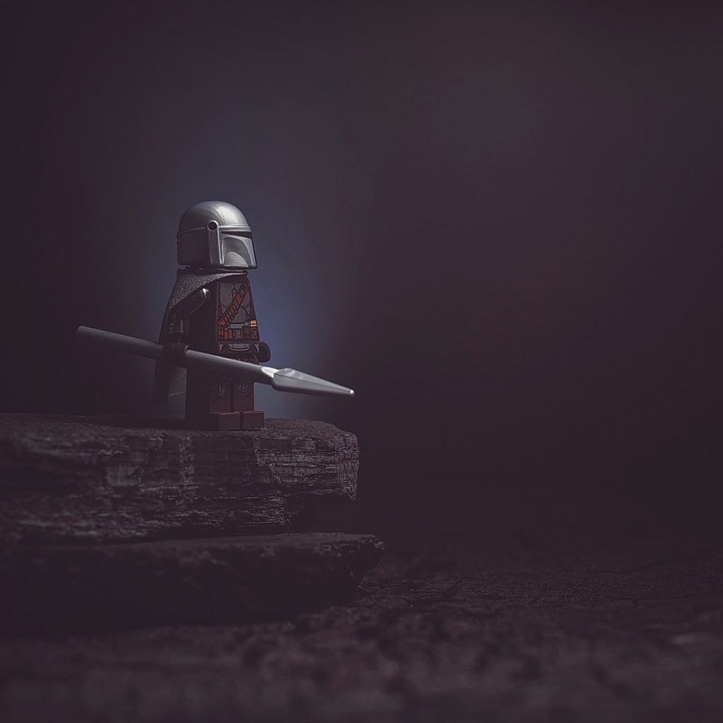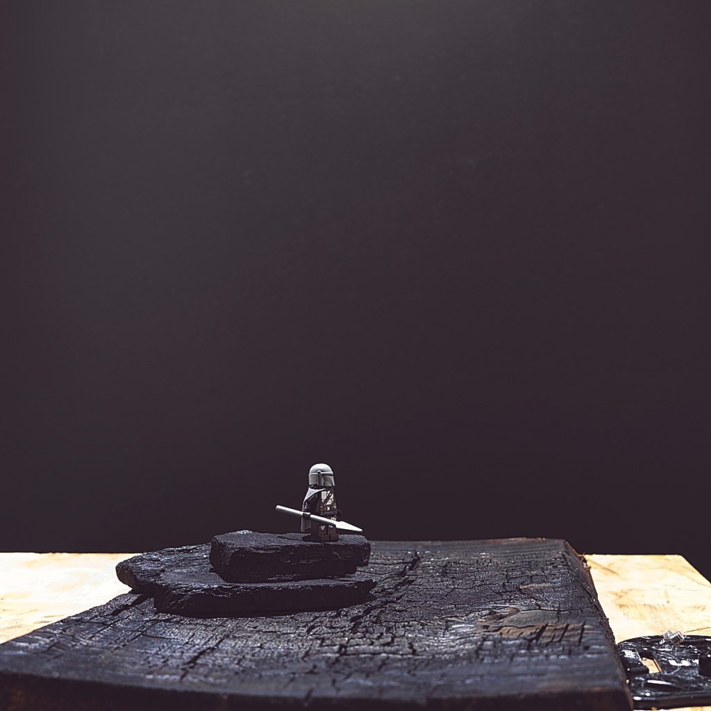 I prefer to keep my scenes simple. Here we see the Mandalorian minifigure standing on a pile of lump charcoal placed upon a charred cedar plank.