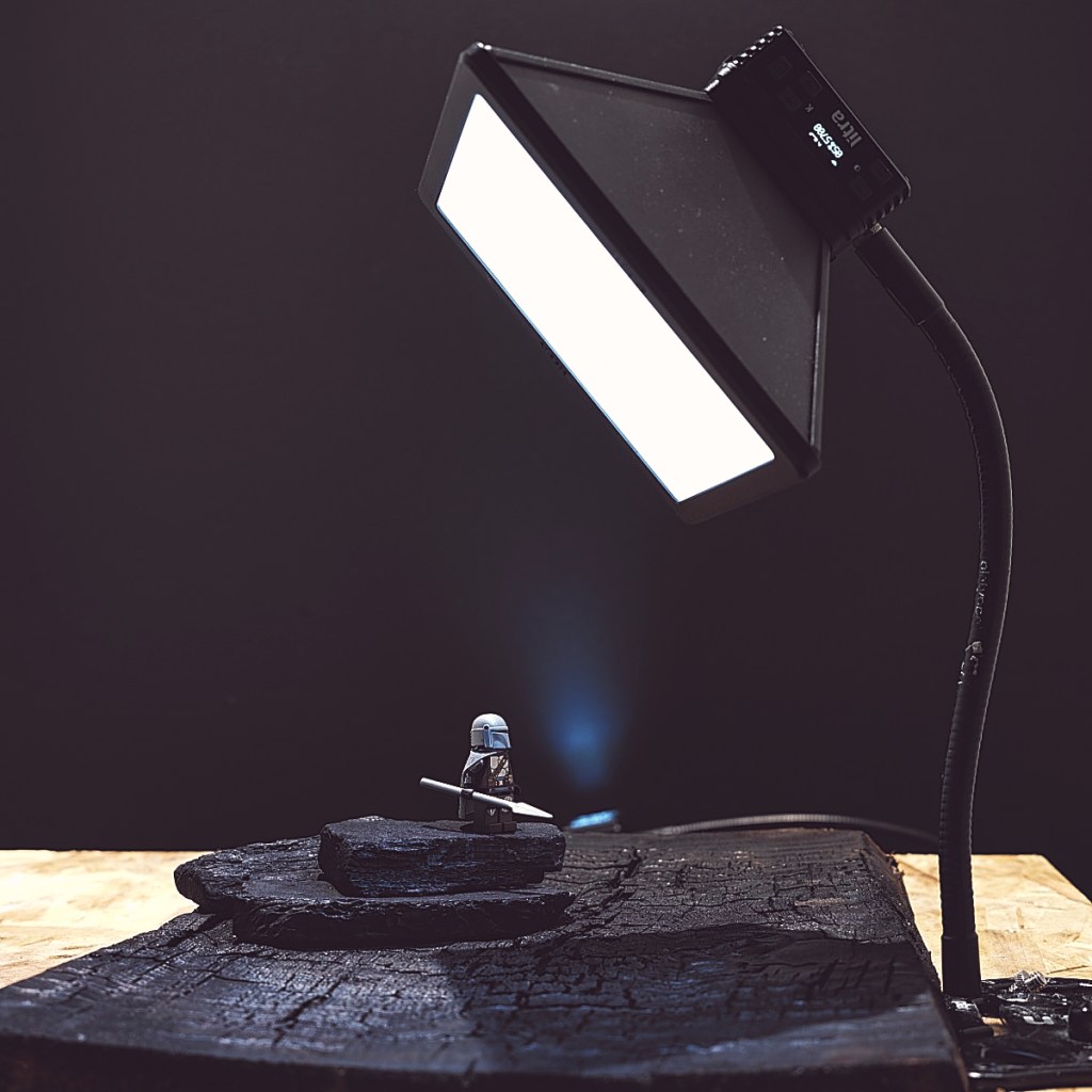 My background light was a Litrpro with grid, also set to 5% brightness at 5700K. I tilted it just slightly with a Platypod gooseneck arm to get the look I wanted, with the light framing the minifigure.