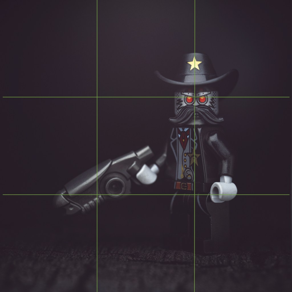 I composed using the rule of thirds, using his central brow as the anchor point and with the star’s apex on a vertical third line. As the blaster is the key supporting accessory, I placed it in profile and as a secondary anchor point that helps balance the image. I left the remainder as empty negative space.
