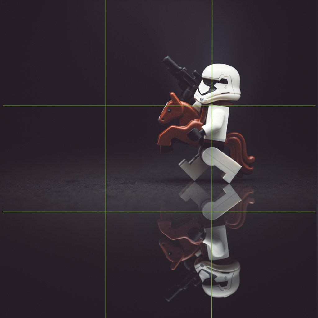 I composed using the rule of thirds, using the front of his shoulder as an anchor point. I put him in profile to show as much as the horse as possible, and in motion to make the scene dynamic. I filled the frame beneath him with his reflection, both for aesthetic and balancing purposes, and left the remainder as empty negative space.