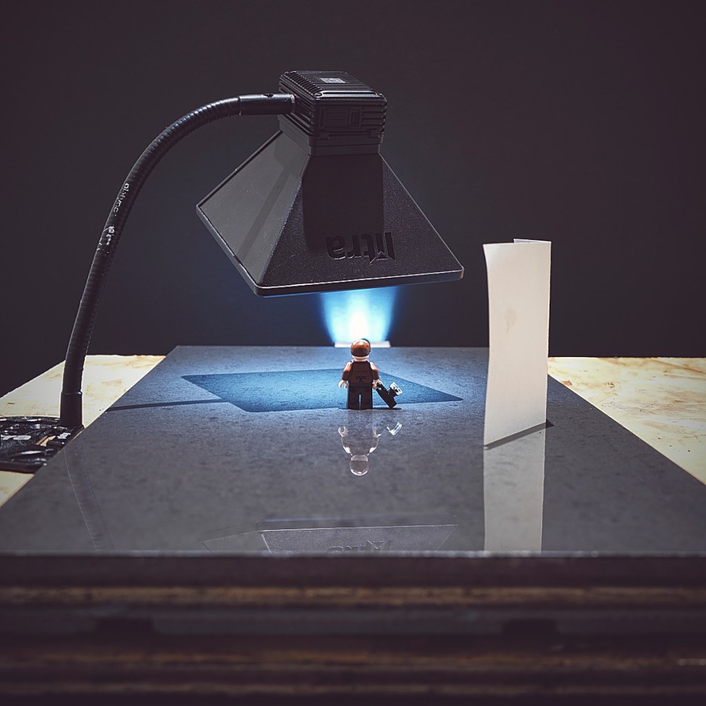 This is a fairly typical lighting setup for me, although to get the silhouette I aimed the main light behind the minifigure and feathered it so that I only caught a few highlights on the subject. :