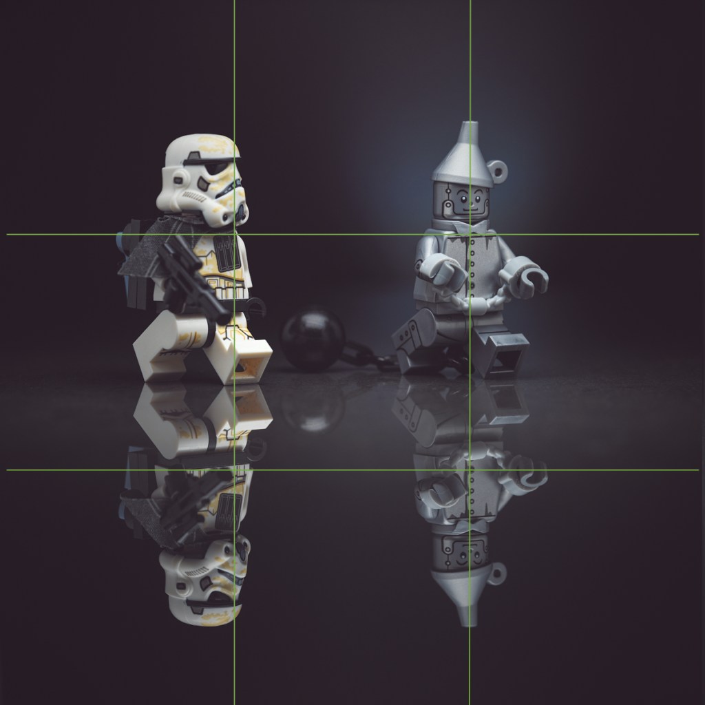I composed using the rule for thirds, using the top centre of the Tin Man’s torso as an anchor point and the Sandtrooper’s shoulder as another. ( I often use the eyes as the anchor points for single characters, but for two I find that I have to pull further back than I like for showing detail).