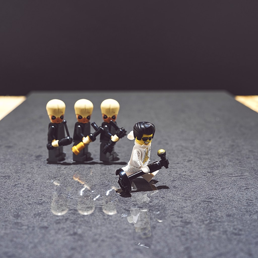 Today’s mashup includes the King of Rock and Roll, a modified Disco Alfred Pennyworth from The LEGO Batman Movie, and the Cantina Band (aka Figrin D’an and the Modal Nodes) from the LEGO Star Wars set 75290 Mos Eisley Cantina.