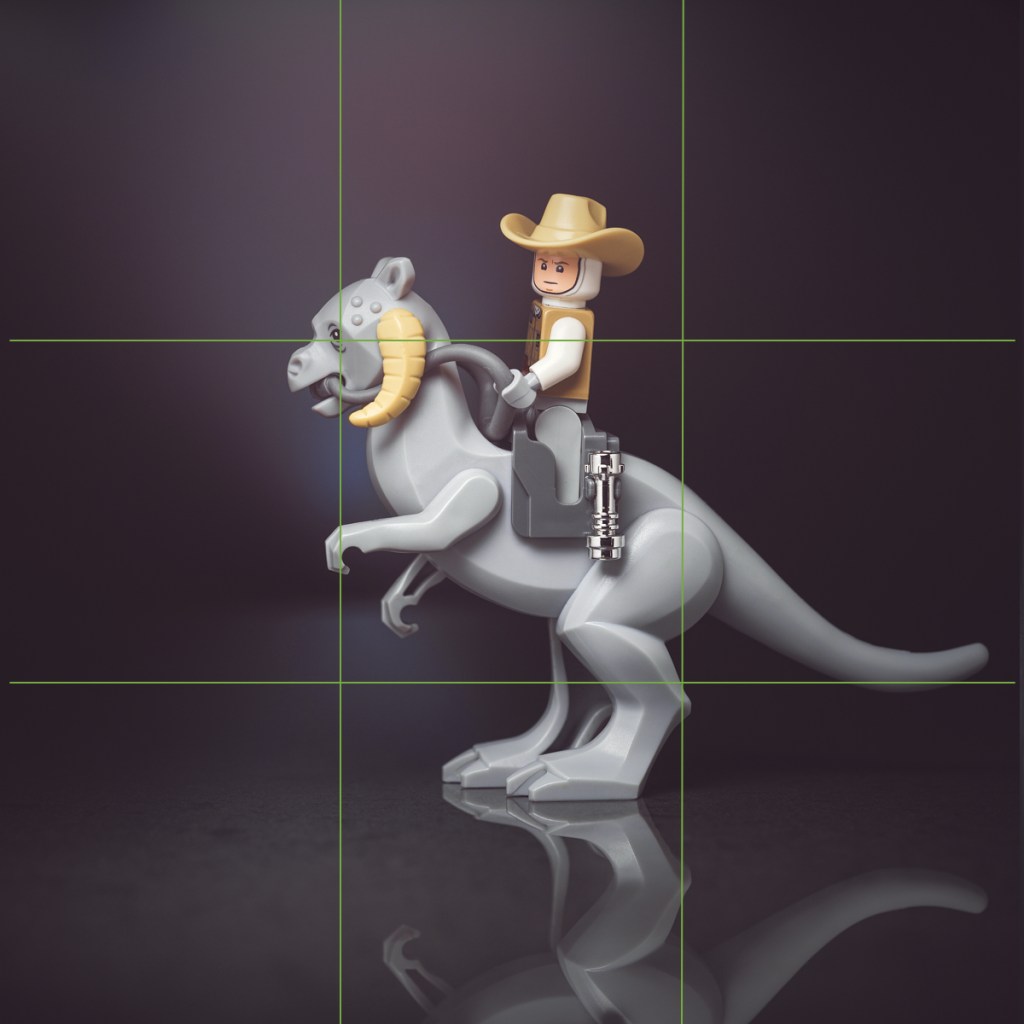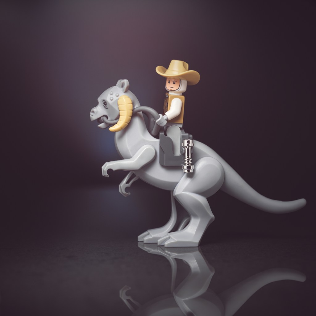 I composed using the rule of thirds, using the tauntaun’s eye as an anchor point. To keep enough detail visible, I chose not to back up so far as to get a full reflection. As usual, I’ve left ample empty negative space around the perimeter for balance.
