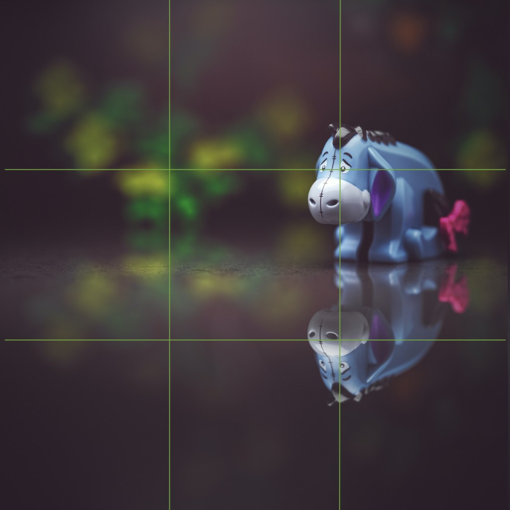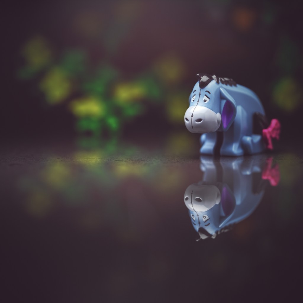 I separated Eeyore from the background with selective depth of field (by shooting wide open at f/4 and knowing that at this working distance the background would blur), lighting, and colour.