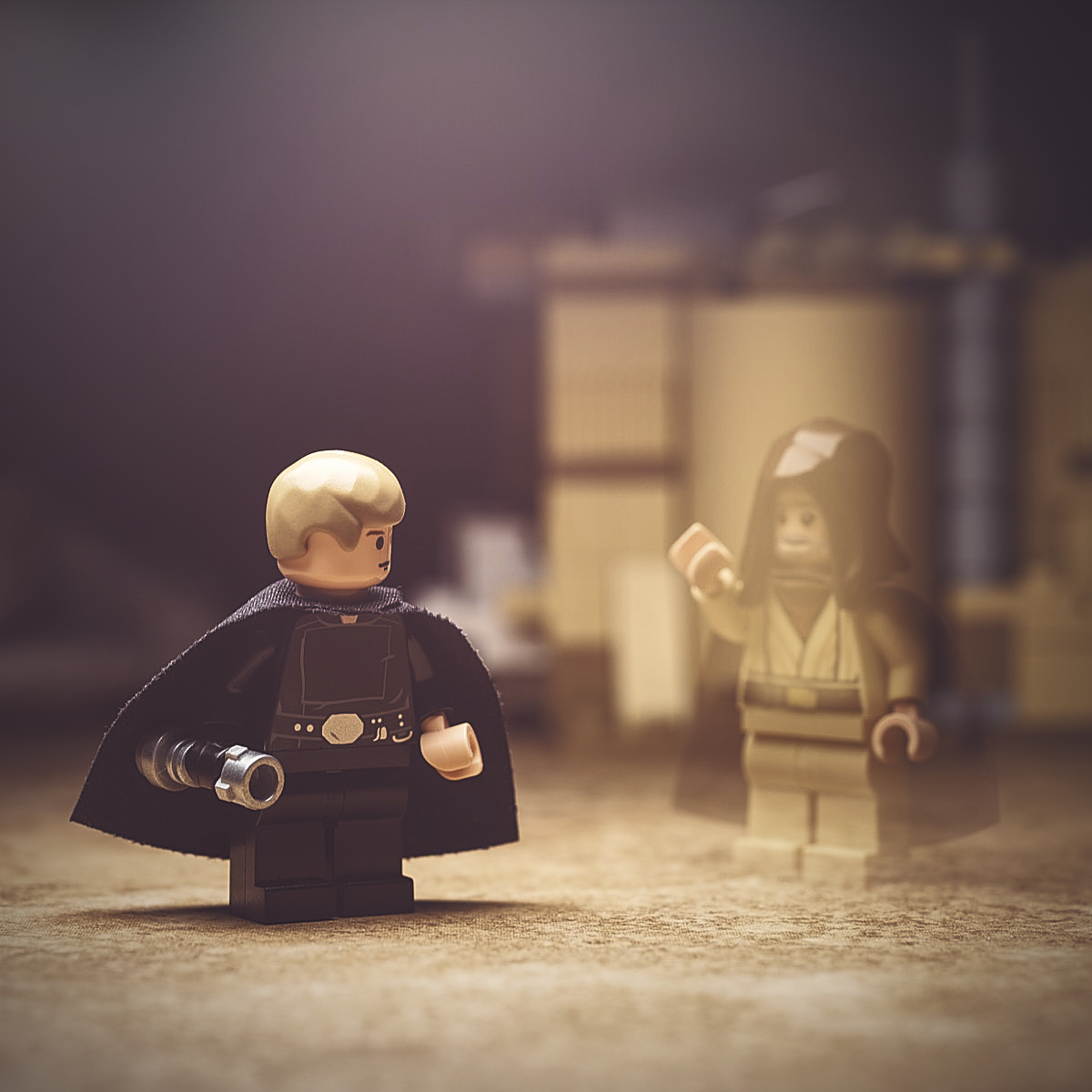 A ghostly Obi-Wan Kenobi waves to Luke Skywalker.